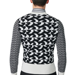 - Ribbed trims, white cuffs, collar, and waistband