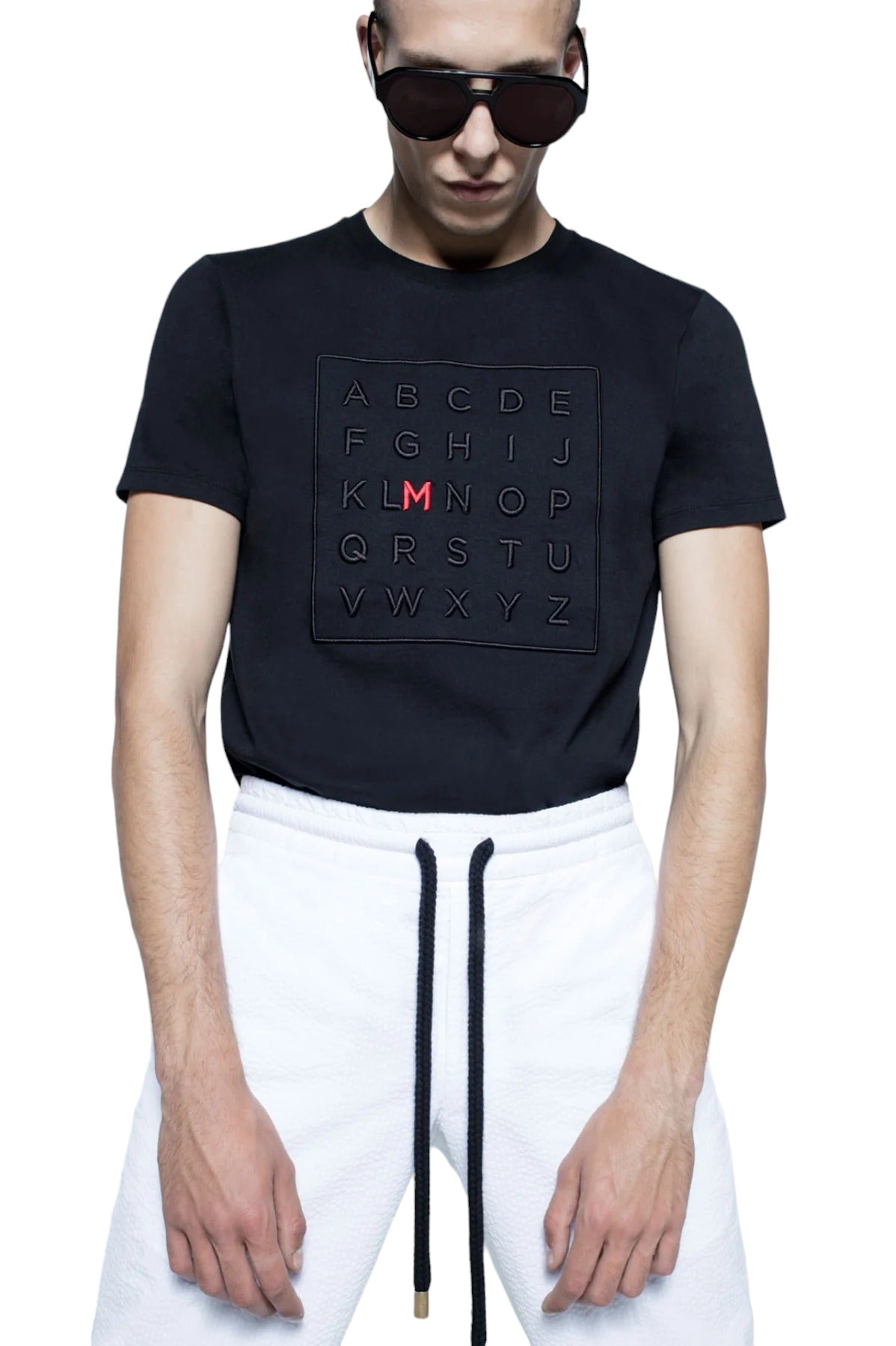 This t-shirt features embroidered alphabet on the chest.