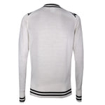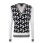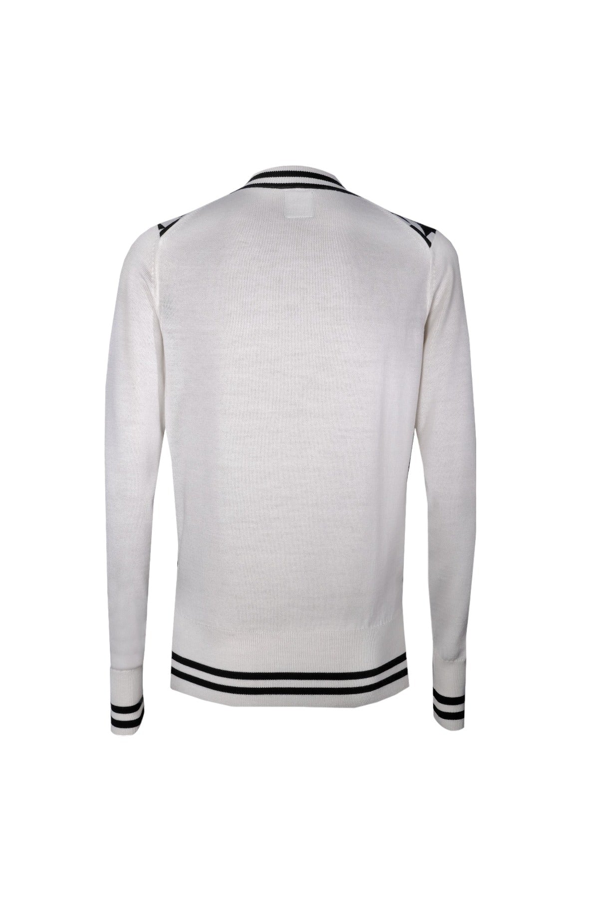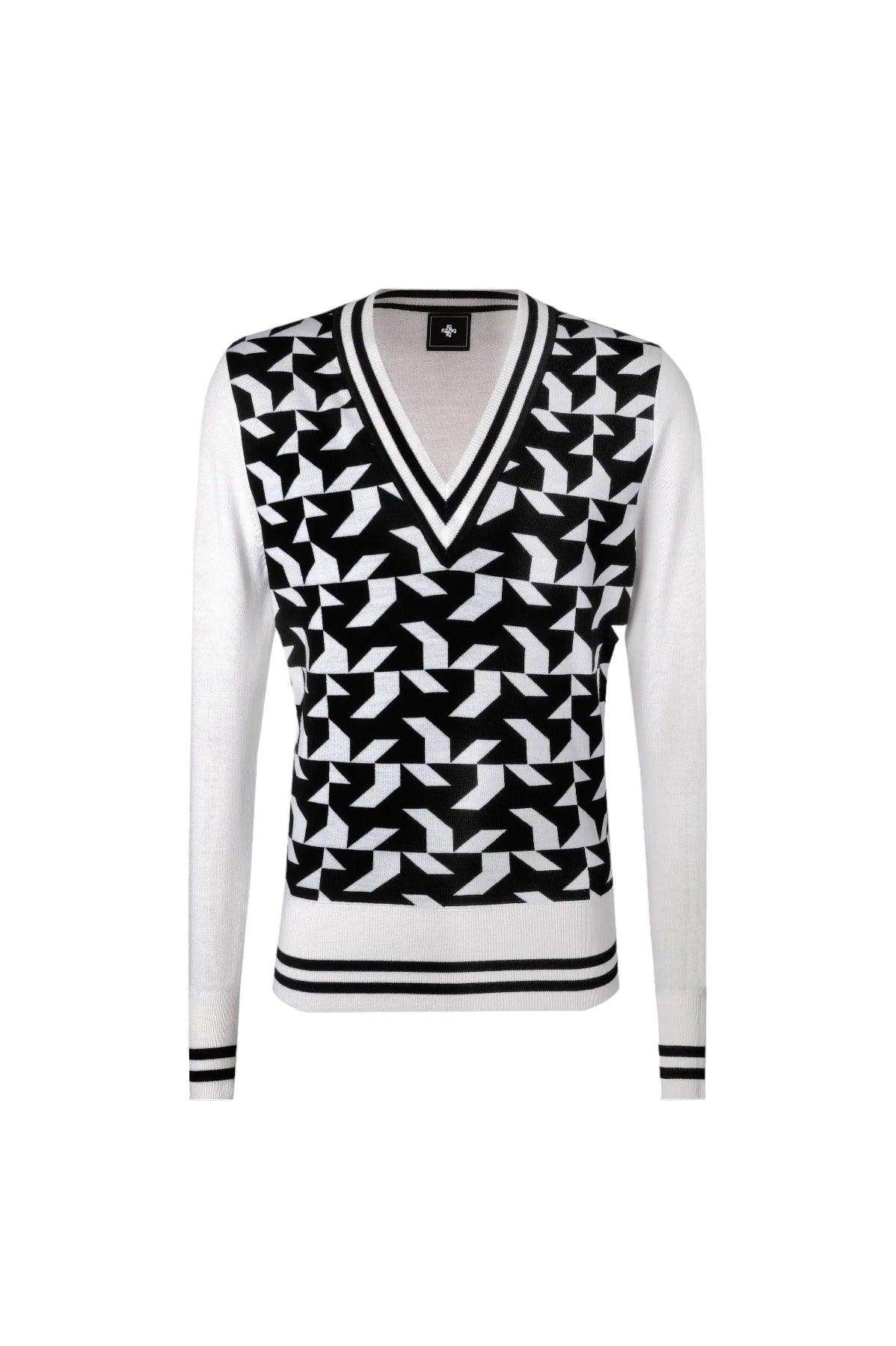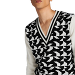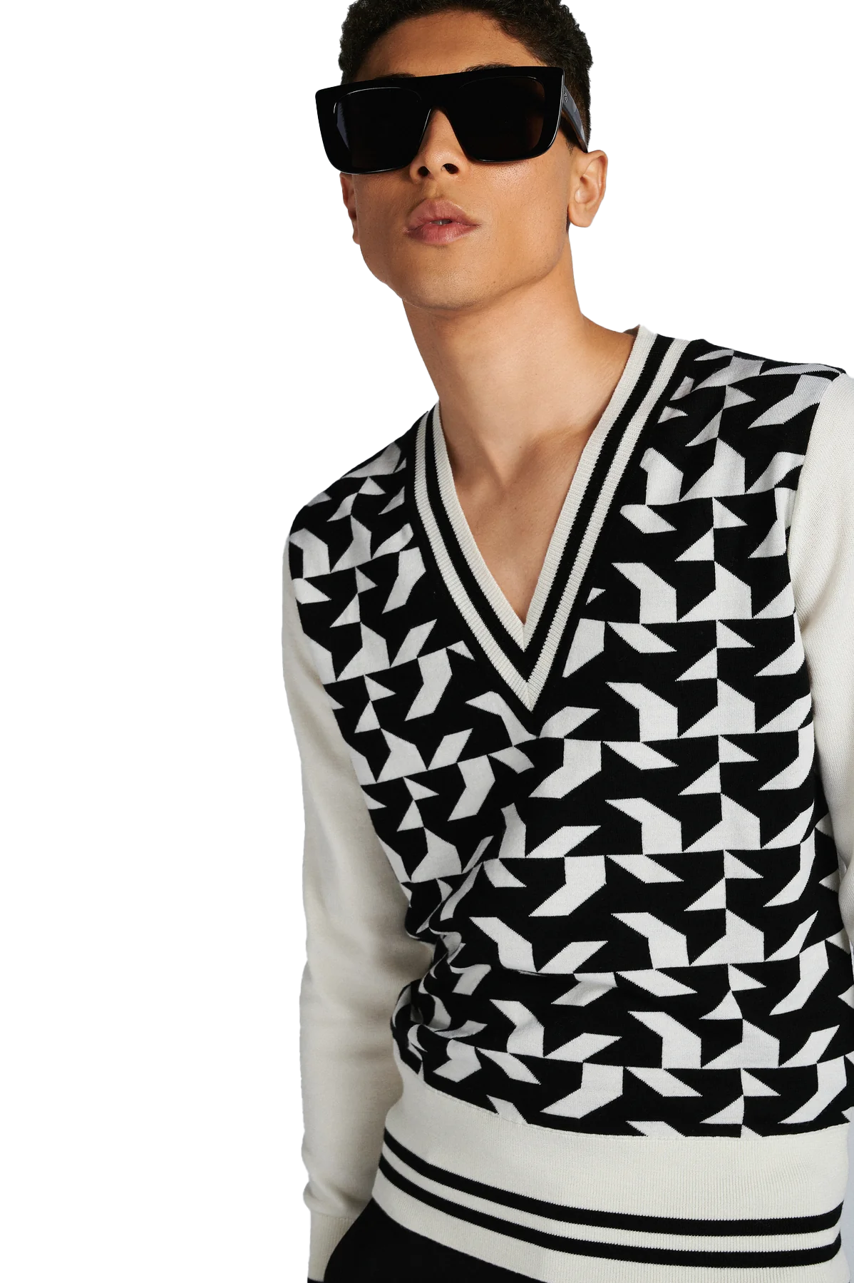 This sweater features a deep V-neck with a geometric logo pattern and 2 black stripes at the neck and cuffs.