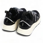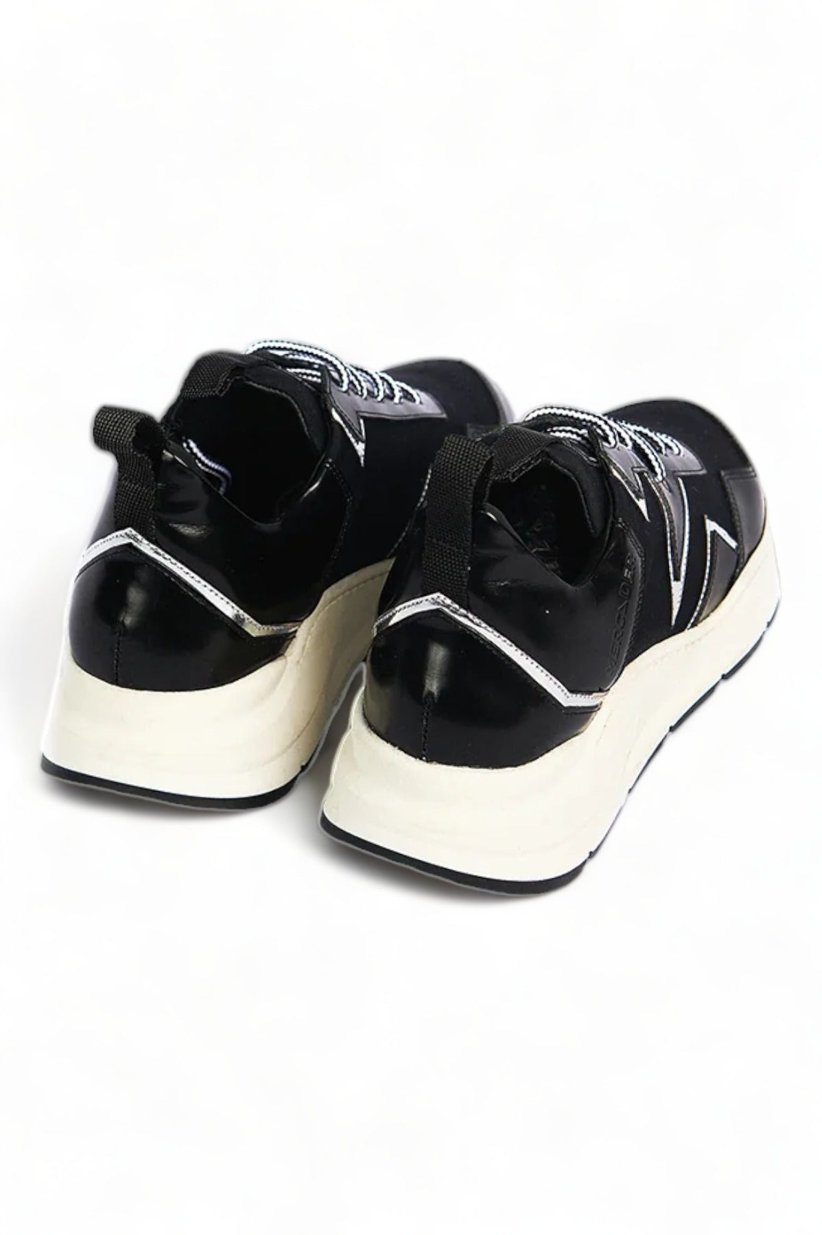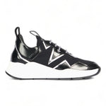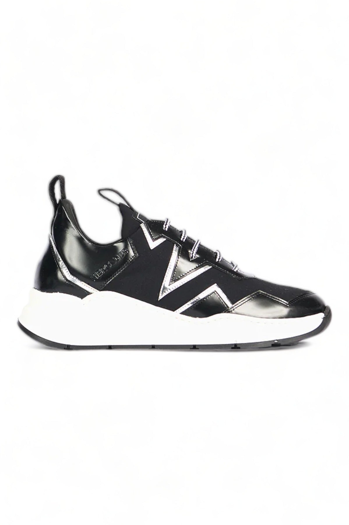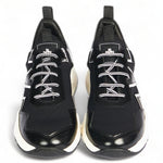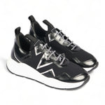 Black Neoprene Lace-Up Sneaker with a futuristic geometric and triangles pattern. The sleek black neoprene and leather upper, accented by glossy silver details and an engraved logo on the side, make this shoe a statement piece. The chunky white rubber sole and round toe offer a perfect blend of fashion and function, while the branded insole guarantees top quality.