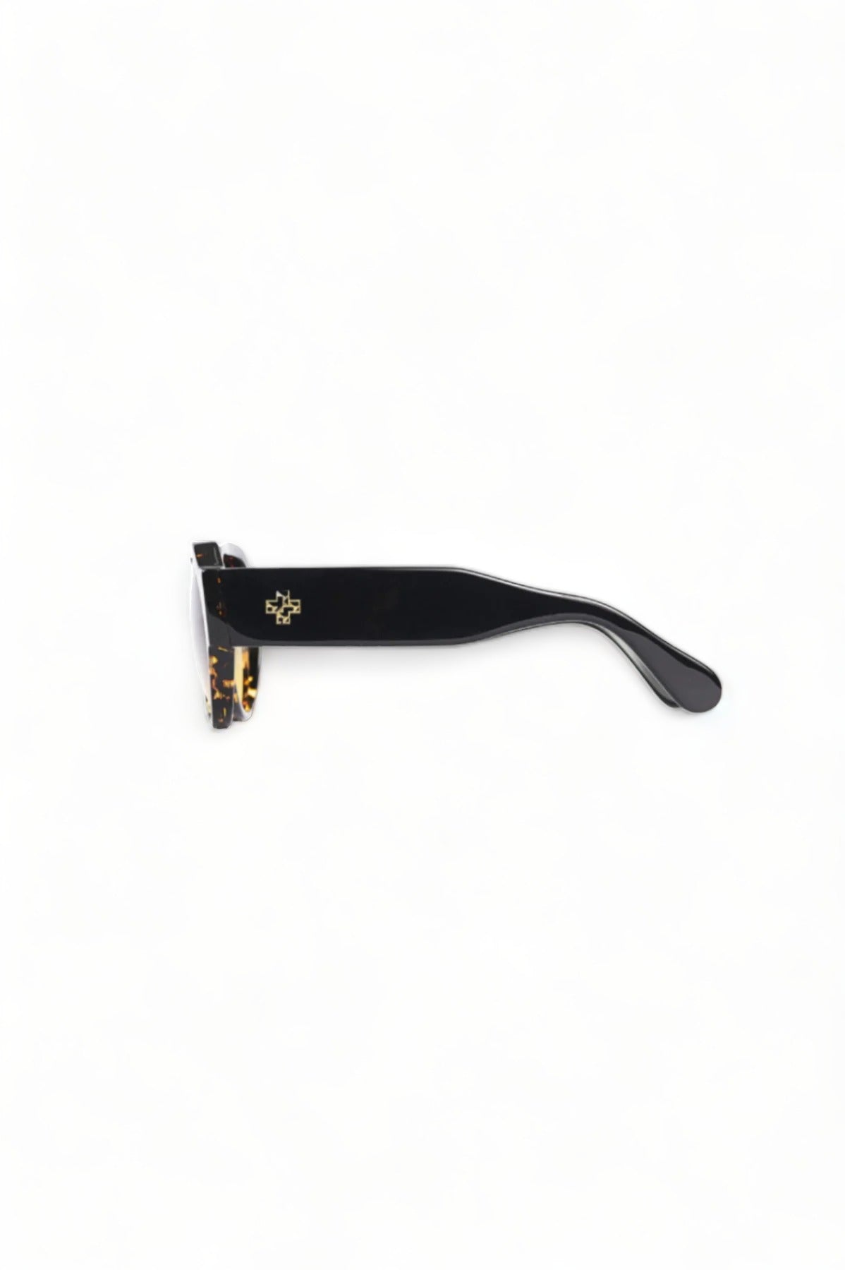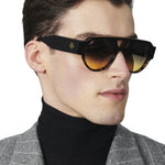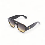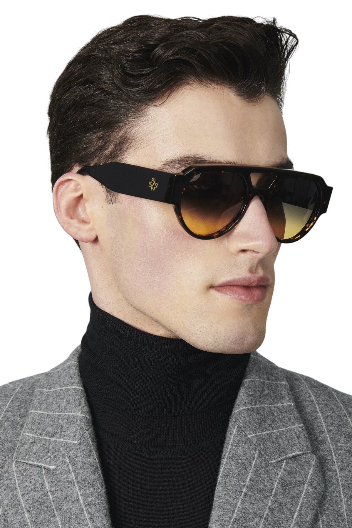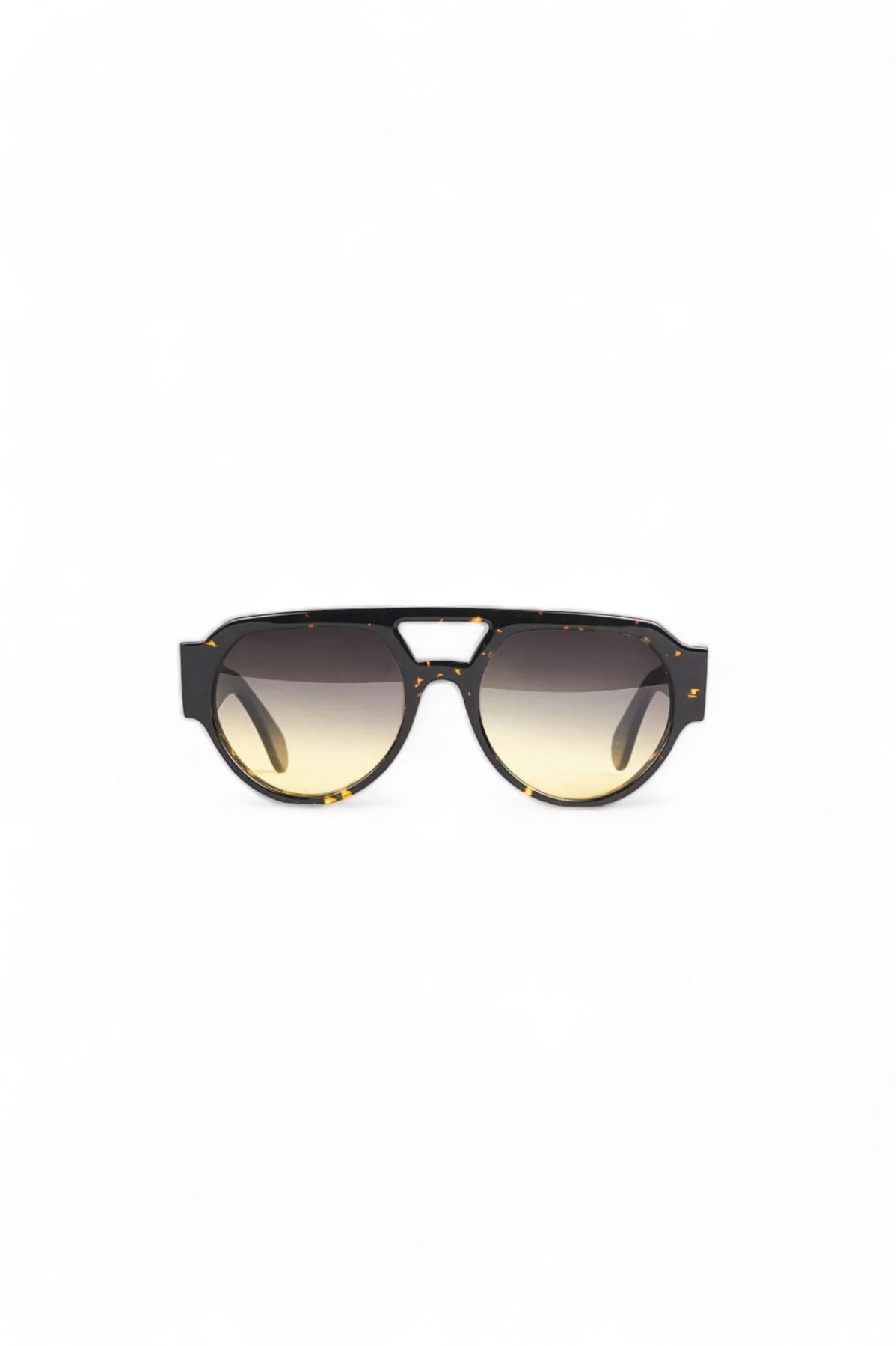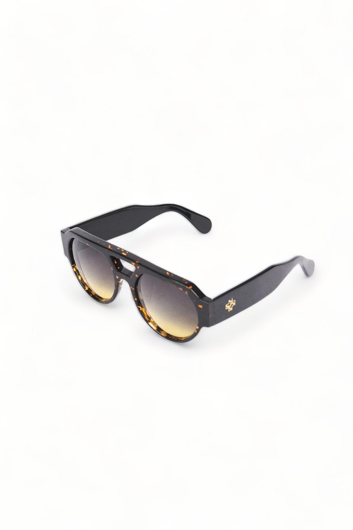 This aviator-frame pair features a tortoiseshell detail on the front and black laterals with yellow lenses, which provides a bright touch and modern design. They're finished with a gold-tone logo on the side.